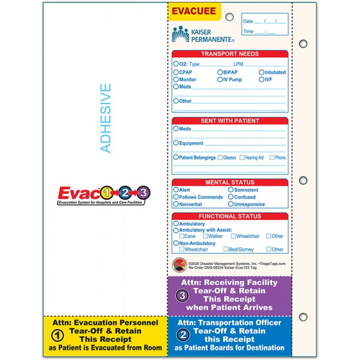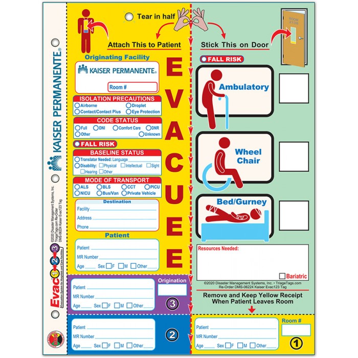 Evac123® Patient Evacuation Tag - Kaiser Permanente Version
